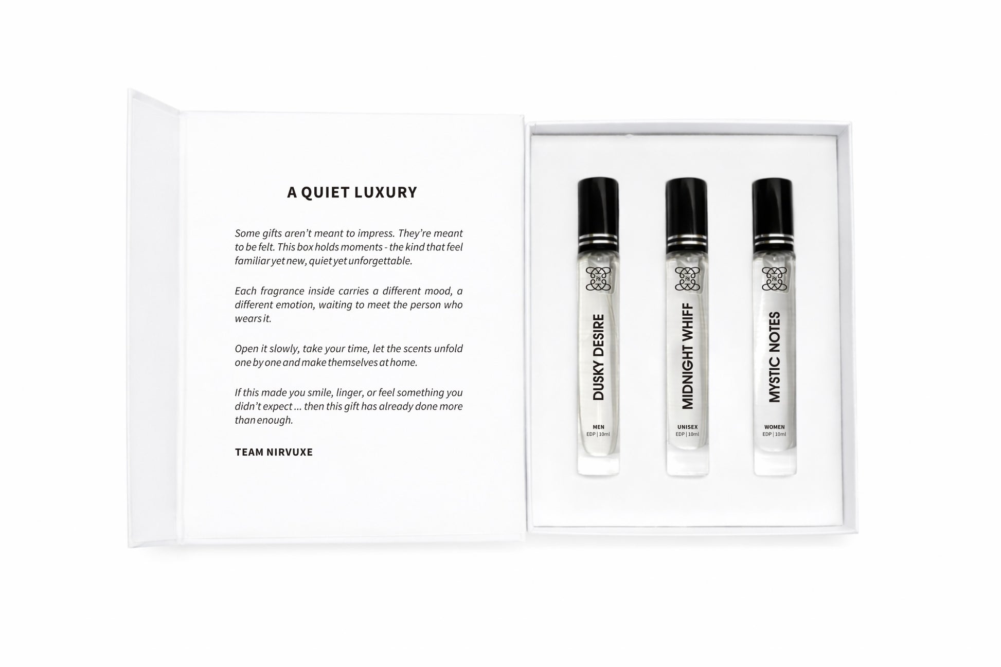 Nirvuxe perfumes typically last 6–8+ hours depending on the fragrance type, skin chemistry, and weather. Deeper notes like oud, amber, and musk last longer on the skin and clothes.